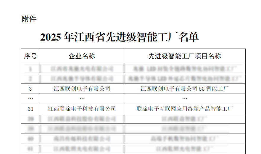 近日,江西省工业和信息化厅正式公布2025年江西省“先进级智能工厂”名单,186家企业入选。其中江西联创电子有限公司、江西联淦电子科技有限公司2家联创电子系企业名列榜单。这标志着公司在智能制造领域的创新成果再次获得政府权威认可。